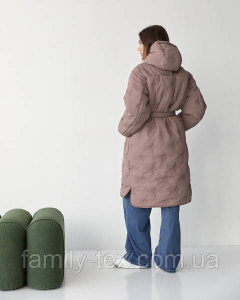 Зимове стьобане пальто прямого вільного покрою оверсайз. На пілочках виробу - прорізні кишені з настрочними листочками. Пальто з комбінованим рукавом покрою реглан та красивим об'ємним капюшоном. Низ рукава - з вузькою пришивною манжетою з еластичною тасьмою. Застібка виробу - центральна на кнопки в тон верху виробу. Виріб з дещо подовженою спинкою відносно пілочки з бічними заокругленими розрізами. В комплекті до пальто йде пасок, але можна носити, як з паском, так і без.