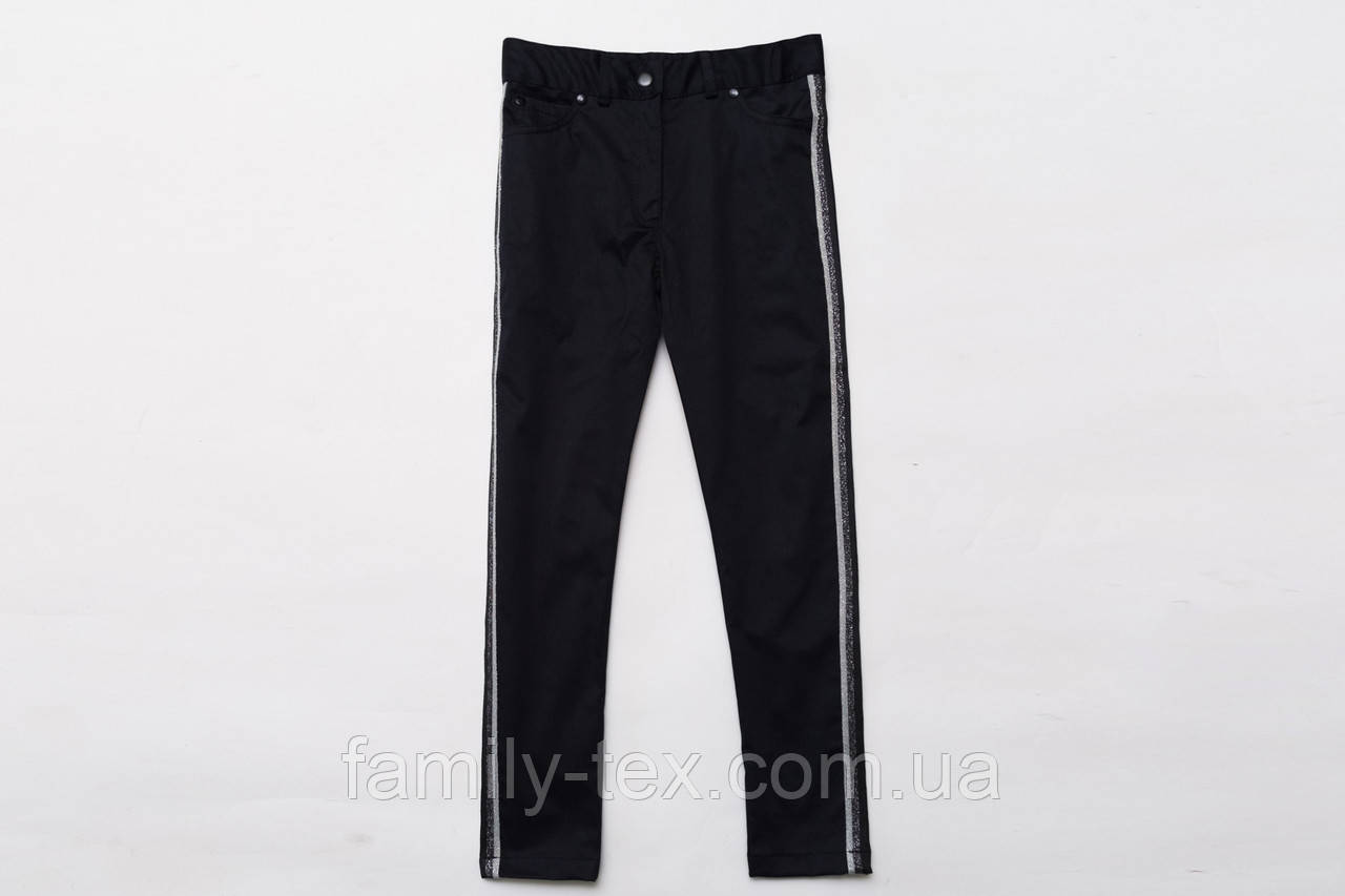 Штани New Style для дівчинки з полегшеного однотонного стейчевого котону чорного кольору в складі тканини 95 % бавовна та 5% еластану - оптимальне співвідношення для створення полегшеної моделі брюк. Матеріал не втрачає колір після прання, легко чиститься щіткою, зручний і практичний у догляді. Штани з середньою посадкою і зауженой штанами мають відмінну посадку. По поясу стягуюча гумка, з можливістю регулювати обсяг талії. Застібка: брючна блискавка кнопка-ґудзик. Спереду і заду по дві кишені. По боках брюки оздоблені чорно-білими лампасами, з невеликим додаванням люрексом. У таких штанів дівчата будь-якого віку будуть виглядати ефектно і стильно. Чорні штани для дівчинки відмінно поєднуються з блузками, жакетами і регланами. Штани для дівчинки підійдуть для школи, прогулянок або свят.