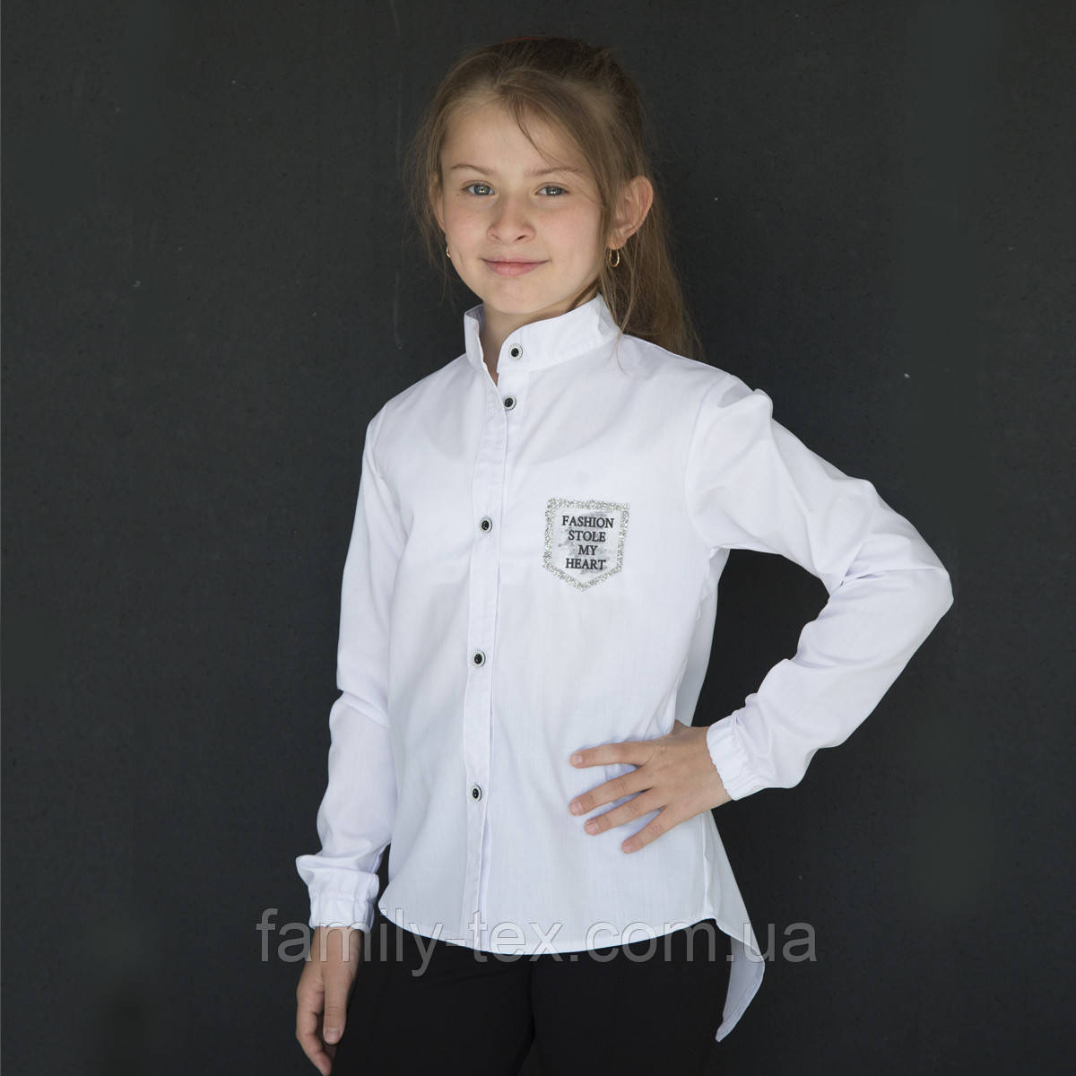 Сорочка білого кольору для дівчинки з довгим рукавом. Має комір-стійку. Застібається на гудзики по всій довжині спереду. Ґудзики темного кольору, що контрастують з білою тканиною. На лівій стороні грудей декоративний елемент з красивими стразами. Низ рукавів на еластичній гумці – і не має застібки. Спинка в сорочці подовжена і має дві частини, що перекривають один одного, що надає сорочці сучасний і стильний вигляд.Сорочки для дівчаток від Смайл Тайм виглядає ошатно і сучасно, підходять для повсякденного носіння або шкільної форми. Модель представлена в асортименті кольорів та широким розмірним поряд від 122 до 170 зростання.